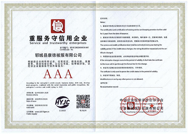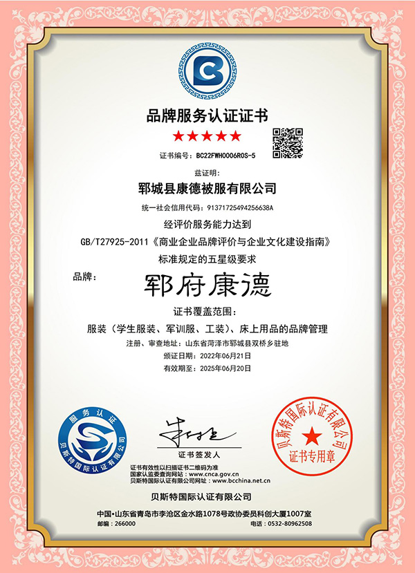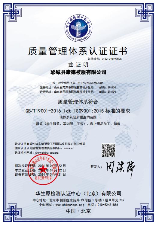 鄆城縣康德被服有限公司能根據(jù)各學(xué)校需求,為其提供棉被、床墊等學(xué)校床上用品,及校服定制、軍訓(xùn)服定制等業(yè)務(wù)!